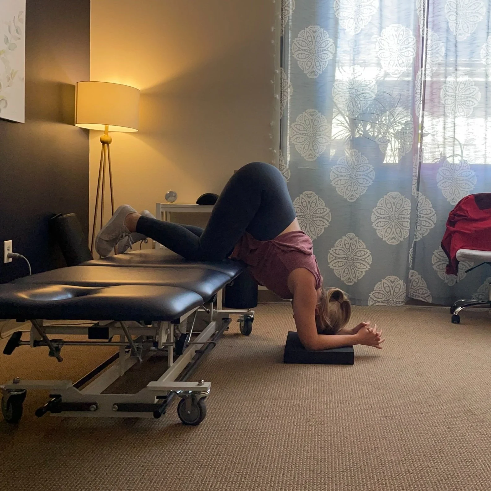 Pelvic tilts on hands and knees with yoga block under one knee for posterior hip expansion, and pelvic outlet mobility